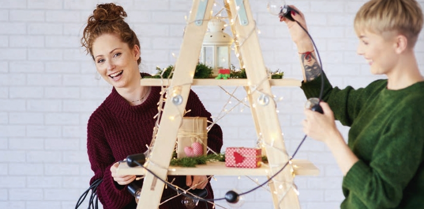 Męczy nas coroczne pakowanie sztucznej choinki i upychanie jej w garażu lub piwnicy, a na sprzątanie igieł po żywej nie mamy już ochoty? Własne oryginalne „drzewko” można zrobić w godzinę i to praktycznie z niczego. Świetnie w tej roli sprawdzi się drabina lub wykonany w jej kształcie regał, kilka patyków, sznurek, a nawet fragmenty starych desek o różnych grubościach i długościach. Po świątecznym sezonie choinka-regał wraca do swojego pierwotnego przeznaczenia, a choinkę z elementów odzyskowych łatwo zdemontować. Konstrukcję ze sznurków i patyków można też zostawić, przeznaczając na ozdoby na inne okazje.